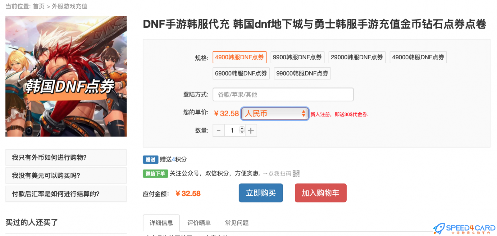 不过感觉上面的这几种方式,很多玩家已经都用腻了,或者说,通过上面的一些方式来充值自己的DNF不便利,所以,新的充值方式,应该是要通过海外线上的代充平台,来充值,才是较好的了,这样的平台,是很多的,Speed4card海外充值商城,就是其中比较好的一个平台了,在Speed4card商城里面,进入首页,基你就能看到DNF商品的信息,没看到的话,在QQ充值栏目,基本上在这个栏目的下面商品列表里面,是可以看到DNF游戏点卡充值的商品的,那么你在这里下单的话,可以直接用你在当前国家的货币(国外的货币),充值自己的游戏点卡的。