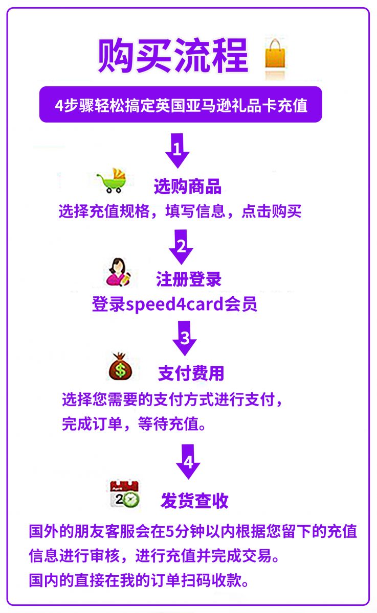 如身在英国为例子,在Speed4card海外充值中心,只需要简单四步就可以成功充值英国亚马逊礼品卡,直接点击图片链接可购买: