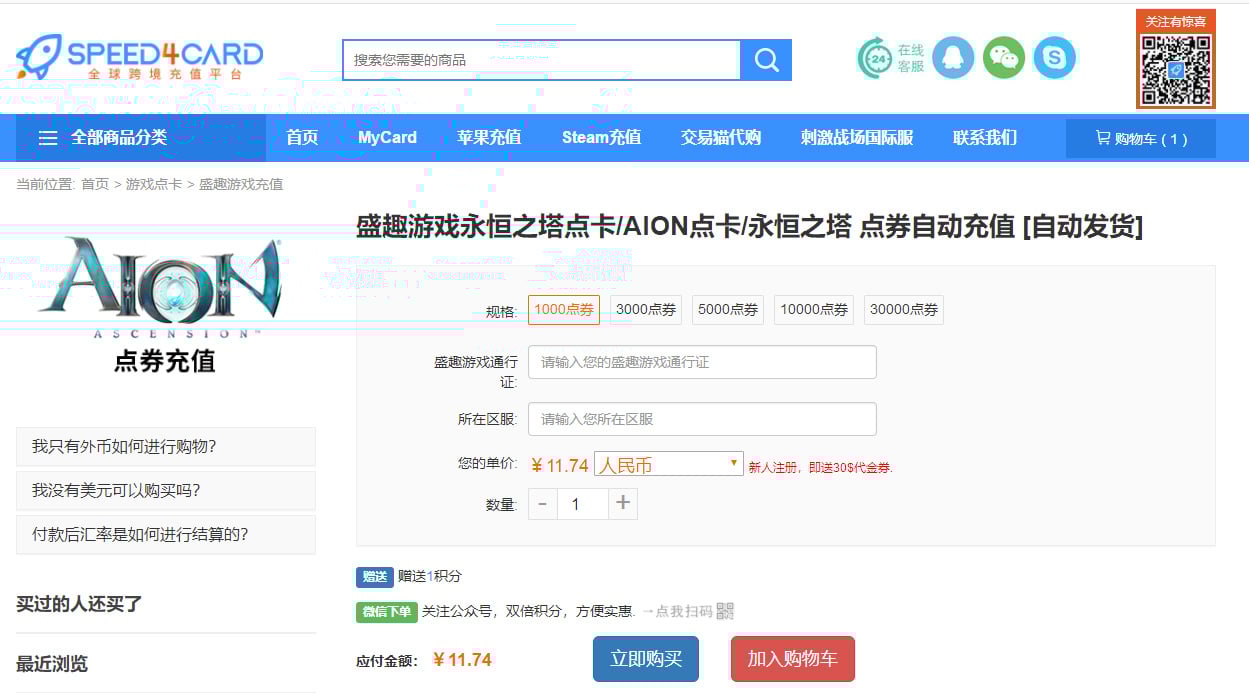 首先,选择一个安全快捷的海外充值平台,我们这里介绍的是许多海外华人留学生信赖的Speed4card,打开Speed4card官网,并找到永恒之塔。