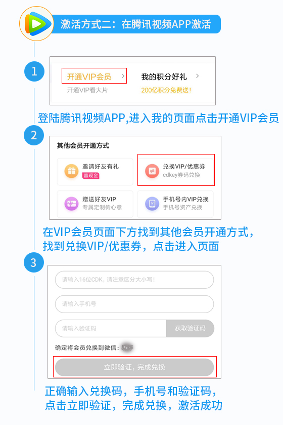 手机和Pad端:手机下载并登录腾讯视频APP → 进入个人中心 → 点击会员卡兑换 → 输入卡密